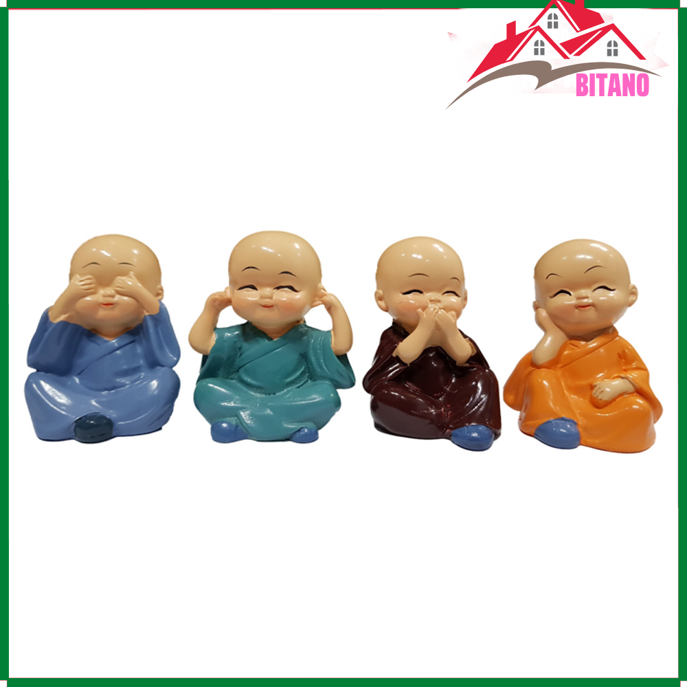 Bộ sản phẩm gồm bốn chú tiểu Cách sử dụng: trang trí ô tô , bàn làm việc, nhà cửa, tủ sách, kệ sách, bàn họ