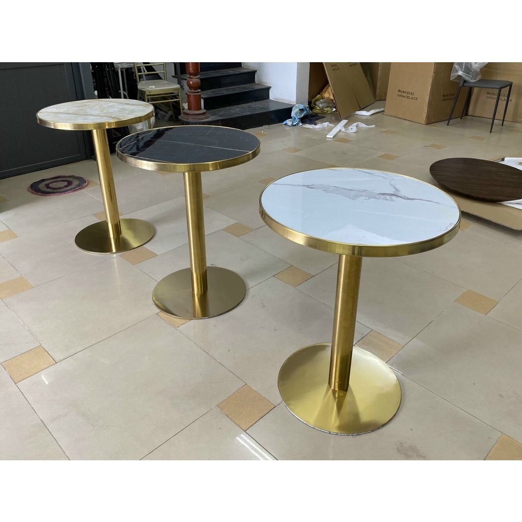 Vật liệu: Mặt Mica vân đá viền inox mạ vàng, Chân inox mạ vàng.