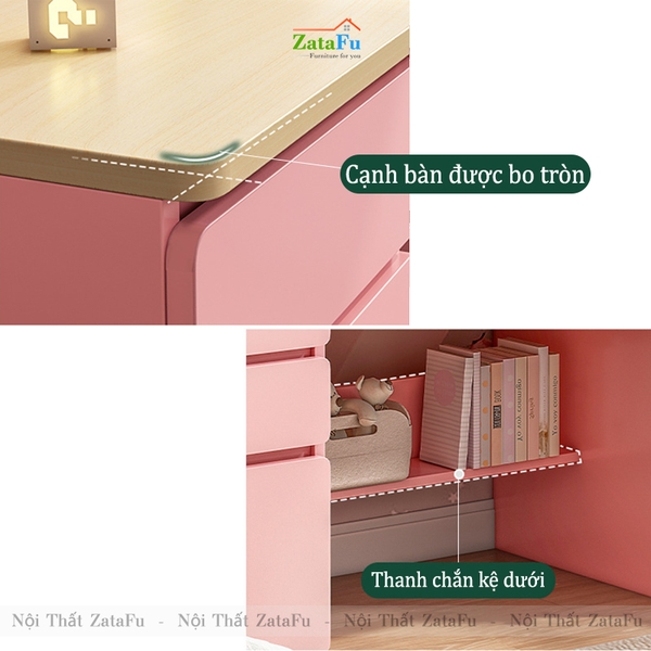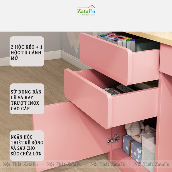 - Một phía chân bàn được tích hợp thêm các chiếc hộc tủ kéo xinh xắn cho con có thể cất và bảo quản các món đồ dùng phục vụ công việc học tập của mình, hạn chế hỏng hóc hay thất lạc mỗi khi con cần sử dụng.