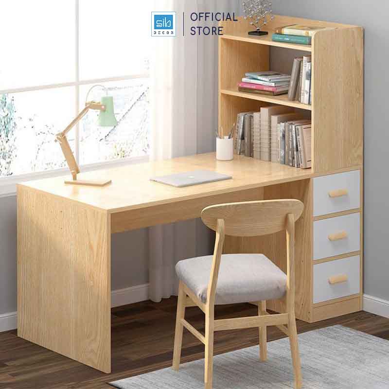 - Hệ tủ sách gồm 3 ngăn kéo và kệ 2 tầng phía trên mặt bàn cho không gian lưu trữ rộng rãi.