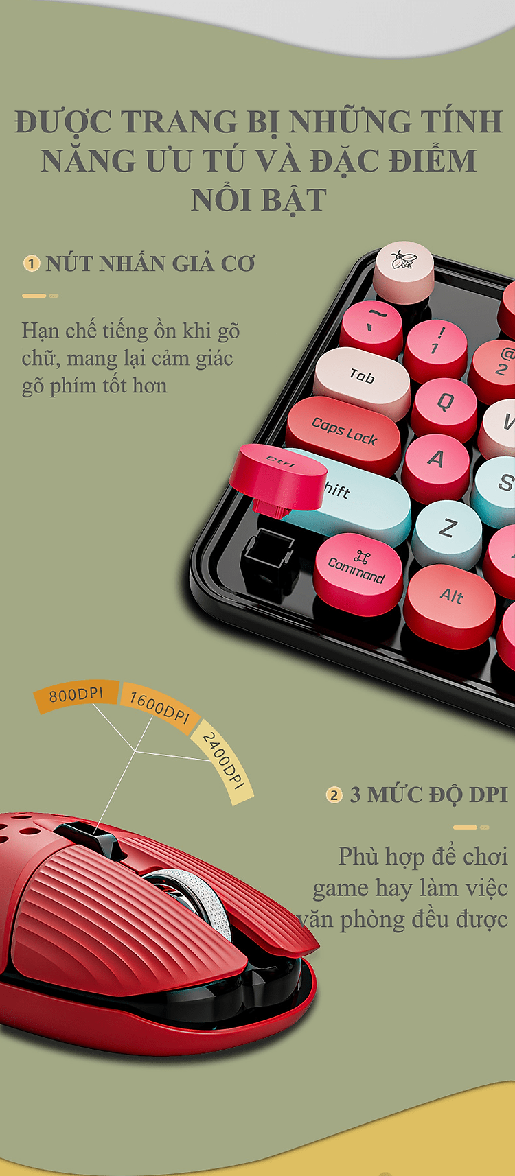 - Kích thước nút bấm vừa vặn các đầu ngón tay, nút bấm siêu nhạy giúp cảm giác gõ phím rất êm và không gây tiếng ồn khi gõ.