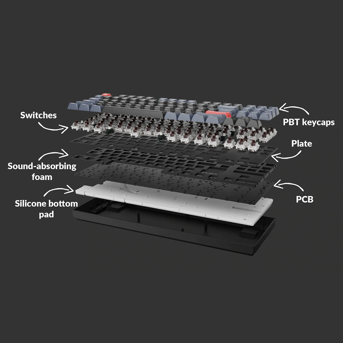 So với phiên bản tiền nhiệm là K8, Keychron K8 Pro là một bản nâng cấp lớn cả về thiết kế và trải nghiệm gõ. Với việc bổ sung thêm lớp Foam tiêu âm, lớp đệm Silicon và Plate Thép mang đến cảm giác gõ cực kỳ đặc biệt và đáng mong đợi.