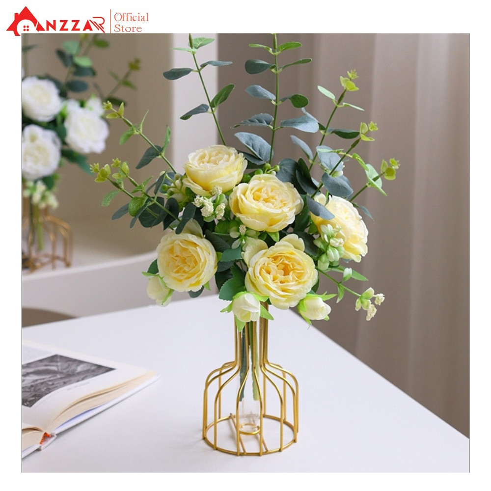 Bình hoa lụa hoa hồng Juliet nhiều màu đẹp thiết kế lọ thủy tinh khung thép mạ vàng trang trí nhà cửa phong cách Bắc Âu