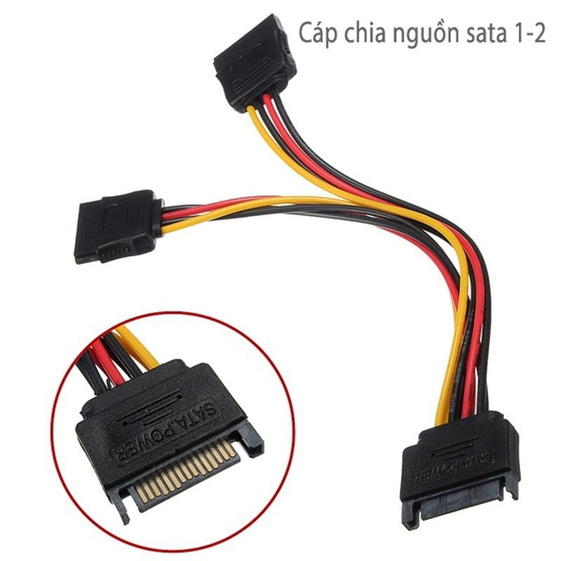 - Cáp chia nguồn SATA 1 ra 2. Chia từ 1 cổng nguồn SATA Male sang 2 cổng nguồn SATA Female Sử dụng cấp nguồn cho ổ cứng SSD, HDD SATA 2.5" 3.5", DVD SATA
