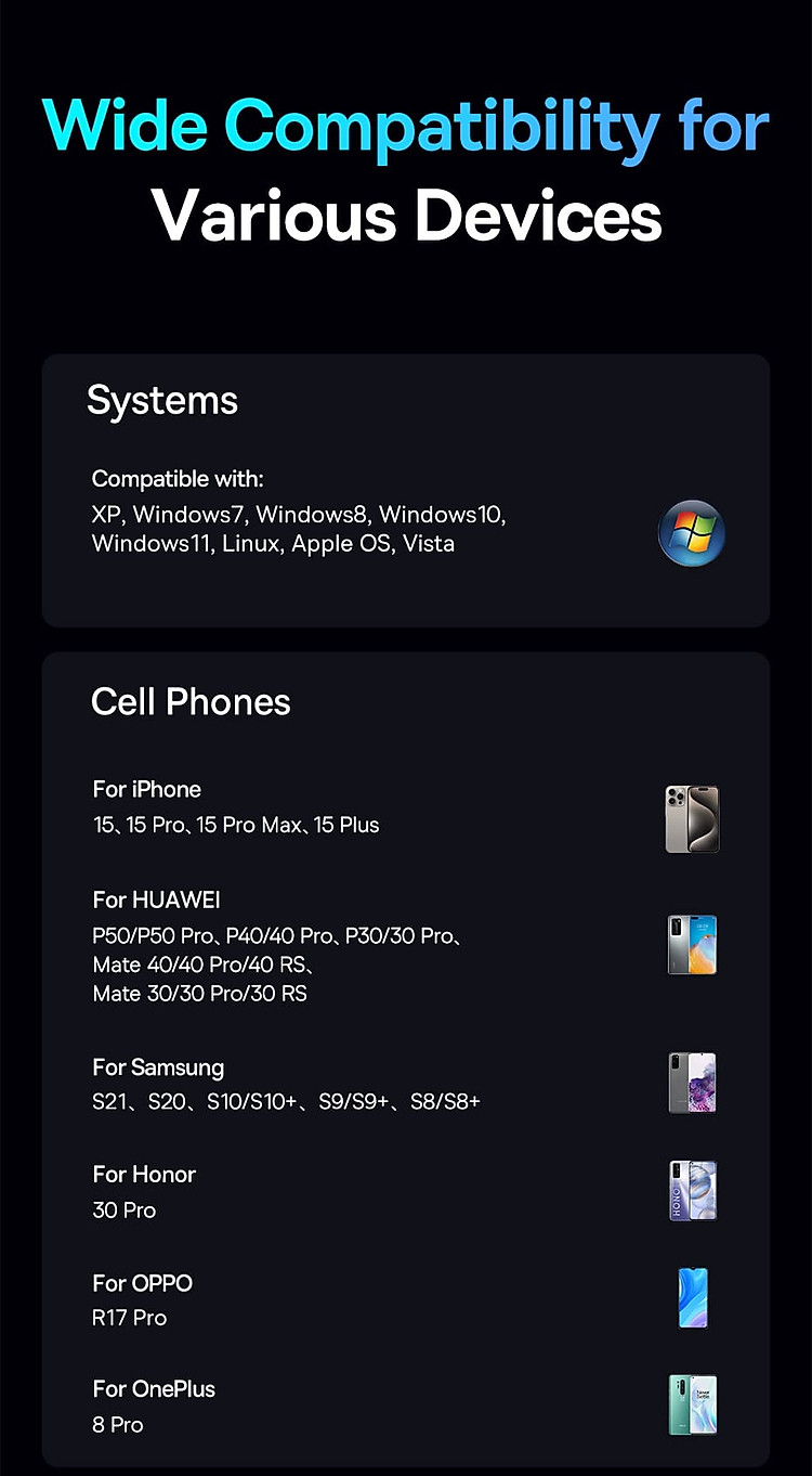 Tương Thích Rộng Rãi: Tương thích với nhiều thiết bị sử dụng cổng Type-C, bao gồm cả laptop, máy tính bảng, và điện thoại thông minh.