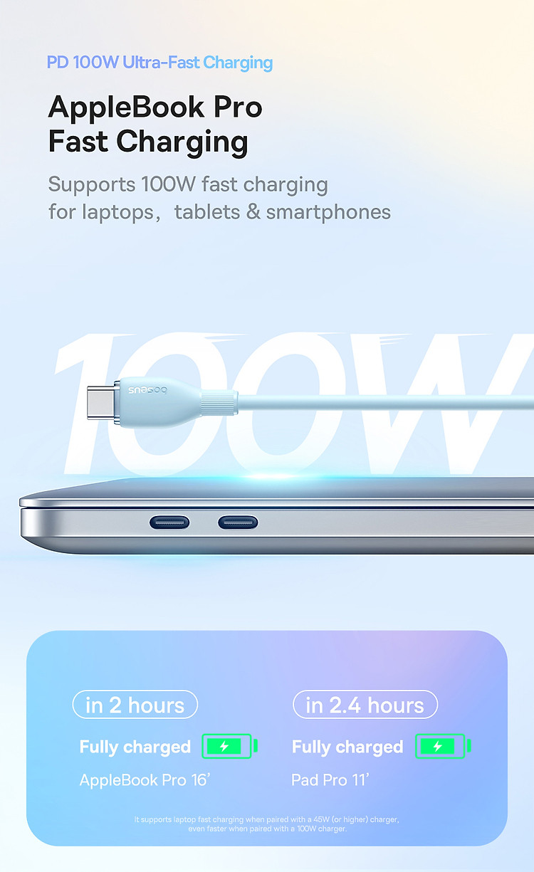 Với công suất sạc lên đến 100W, cáp này cho phép bạn nạp năng lượng nhanh chóng cho các thiết bị như điện thoại di động, máy tính bảng, laptop và các thiết bị khác hỗ trợ công nghệ sạc nhanh.