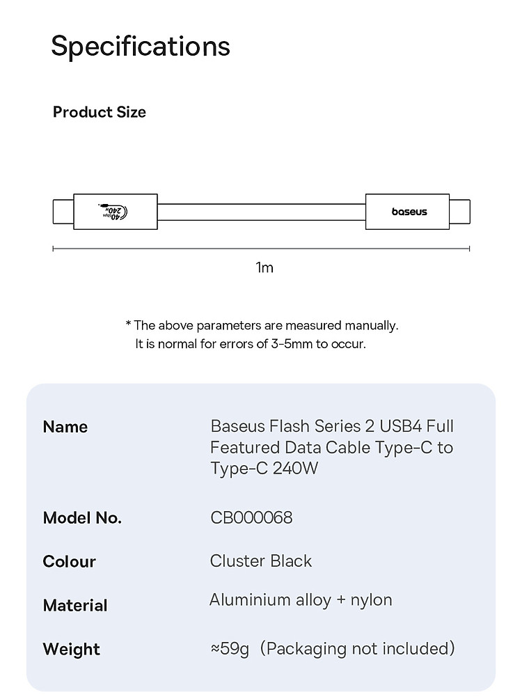 | Tên | Cáp Sạc Nhanh Truyền Dữ Liệu Baseus Flash Series 2 USB4 Full Featured Data Cable Type-C to Type-C 240W |