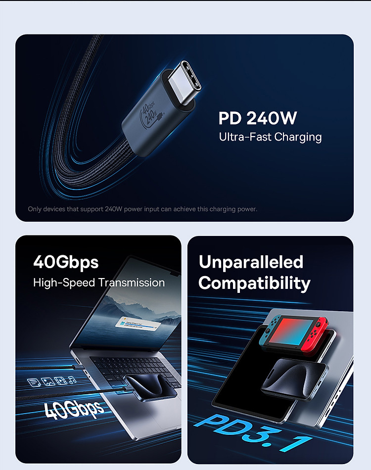 Tốc Độ Sạc 240W: Với khả năng chịu tải công suất lên đến 240W, cáp này đáp ứng nhanh chóng nhu cầu sạc của các thiết bị công suất cao như laptop và các thiết bị di động thông minh.