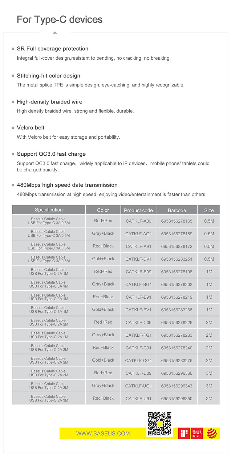 Với các tính năng sạc nhanh, truyền dữ liệu tốc độ cao và độ bền cao, cáp Baseus Cafule Cable USB For Type-C 2A là một lựa chọn phổ biến cho người dùng có nhu cầu sạc và truyền dữ liệu hiệu quả và tin cậy.