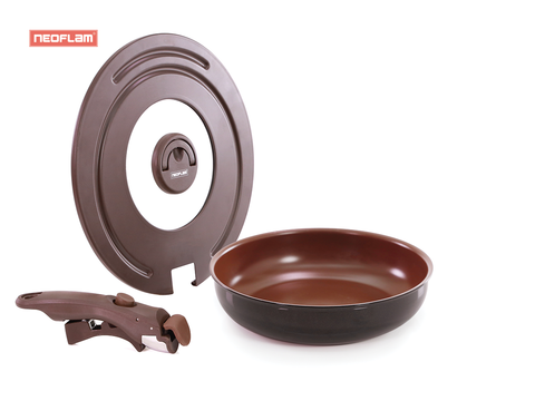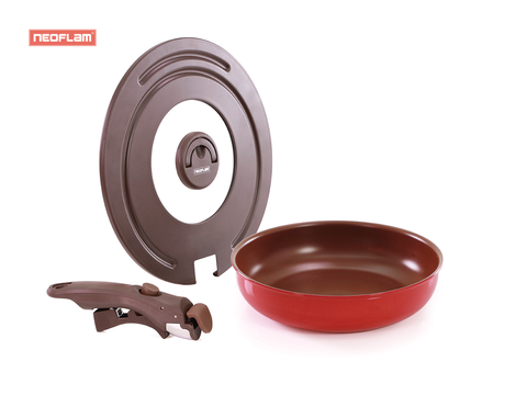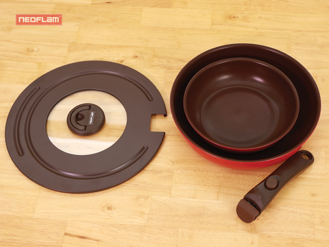 Combo gồm: Chảo có kích thước trung 26cm, vung nhôm kính, cán tháo rời Melamine. Lòng chảo phủ chống dính của Daikin- Nhật Bản, tăng cường khả năng chống dính và chống trầy xước.