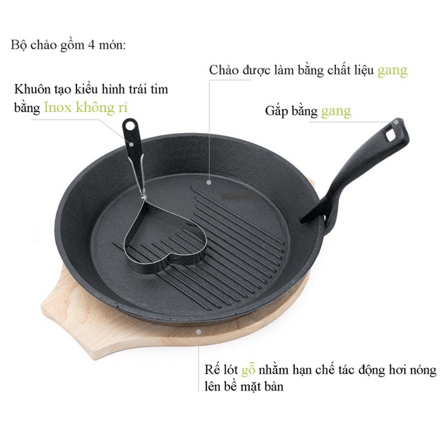 Giới thiệu Bộ Chảo Gang Tròn Chống Dính Đế Gỗ ( Tặng kèm vòng chiên trứng hình tim + gắp nóng)