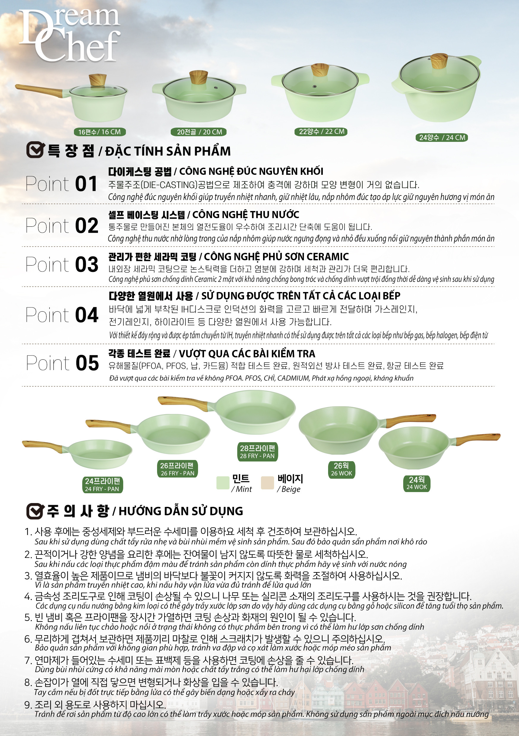 Hướng dẫn sử dụngHƯỚNG DẪN SỬ DỤNG:1. Sau khi sử dụng, dùng chất tẩy rửa nhẹ và bùi nhùi miềm vệ sinh sản phẩm. Sau đó bảo quản sản phẩm nơi khô ráo2. Sau khi nấu các loại thực phẩm đậm màu, để tránh sản phẩm còn dính thực phẩm, hãy vệ sinh với nước nóng.3. Vì là sản phẩm truyền nhiệt cao, khi nấu hãy vặn lửa vừa đủ tránh để lửa quá lớn4. Các dụng cụ nấu nướng bằng kim loại có thể gây trầy xước lớp sơn do vậy hãy dùng các dụng cụ bằng gỗ hoặc silicon để tăng tuổi thọ sản phẩm5. Không nấu liên tục chảo hoặc nồi ở trạng thái không có thực phẩm bên trong vì có thể làm hư lớp sơn chống dính6. Bảo quản sản phẩm với không gian phù hợp, tránh va đập và cọ xát làm xước hoặc móp méo sản phẩm7. Dùng bùi nhủi cứng có khả năng mài mòn hoặc chất tẩy trắng có thể làm hư hại lớp chống dính8. Tay cầm nếu bị đốt trức tiếp bằng lửa có thể gây biến dạng hoặc xảy ra cháy9. Tranh để rơi sản phẩm từ độ cao lớn có thể làm trầy xước hoặc móp sản phẩm. Không sử dụng sản phẩm ngoài mục đích nấu nướng.