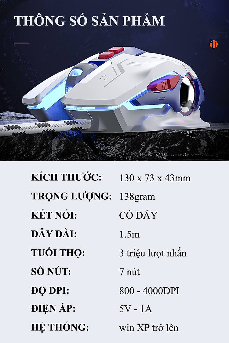• Độ nhạy từ 800DPI đến 4000DPI phù hợp chơi game, làm việc văn phòng, thiết kế...