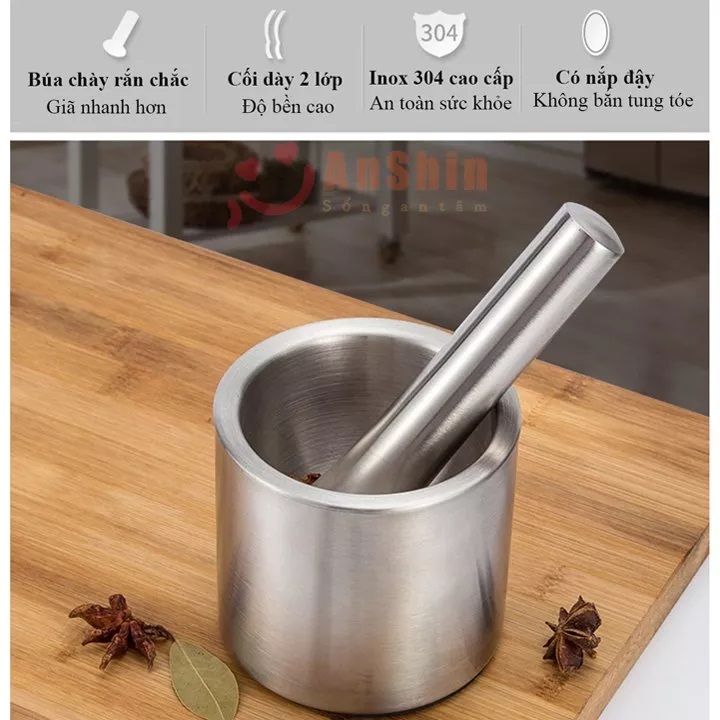 Bộ cối giã chất liệu inox 304 có nắp rất sang trọng, không trơn trượt