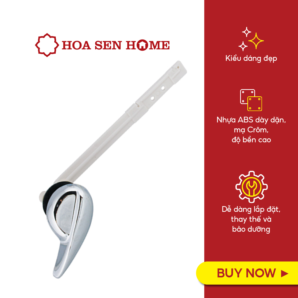 - Sản phẩm được sản xuất từ nhựa ABS dày dặn, bền, bên cạnh đó, bề mặt cụm gạt được mạ Crom để tạo vẻ ngoài sáng bóng, sạch sẽ giúp tăng mỹ quan của bồn cầu.