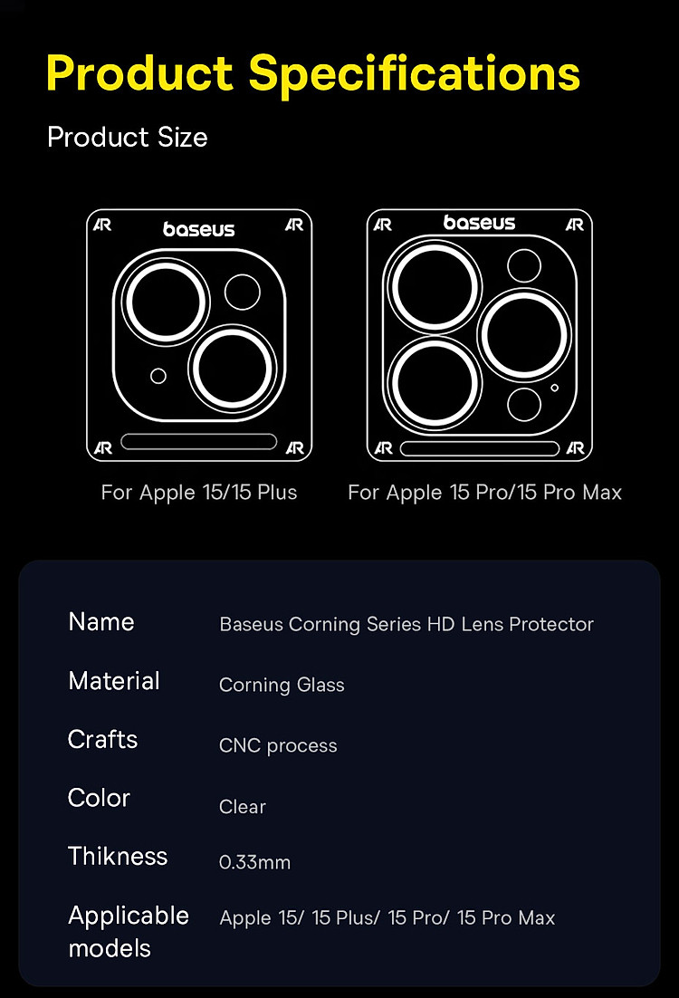 | Tên | Cường Lực Camera Baseus Corning Series HD Lens Protector for iP 15 |