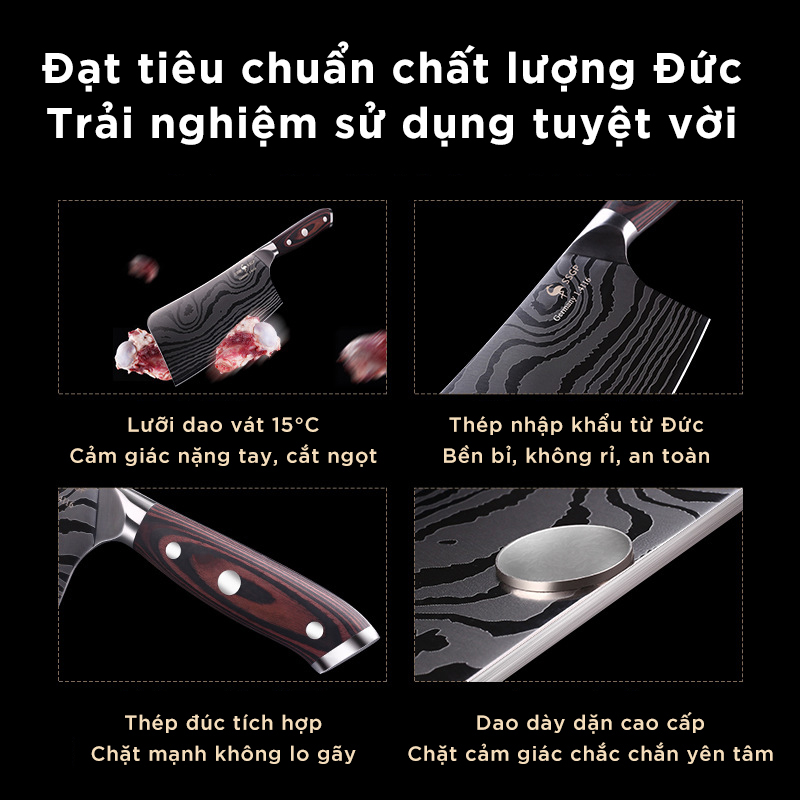 - Dao chặt xương với Inox chất lượng cao nhập khẩu từ Đức + công nghệ xử lý nhiệt cao ở 1080°C tạo độ ra cứng 56HRC xuất sắc.