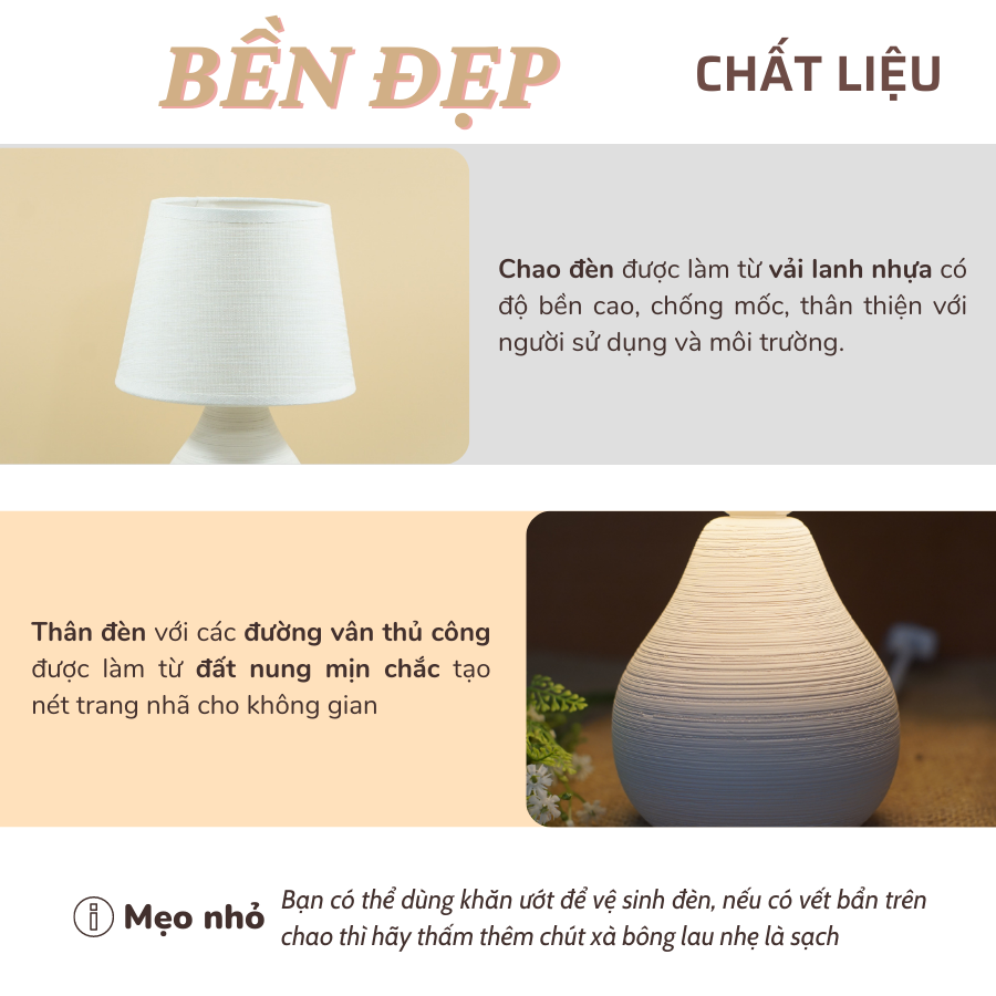 - Chất liệu đèn ngủ: thân đèn được làm từ đất nung mịn chắc, chao đèn làm từ vải lanh nhựa