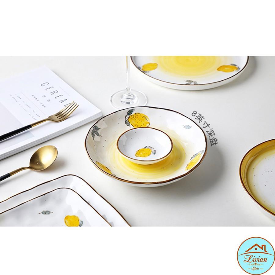 � Đĩa sứ chanh vàng được thiết kế cực kỳ dày dặn với các họa tiết chanh vàng tươi tắn giúp trang trí bàn ăn của bạn thêm sinh động hấp dẫn.