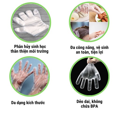 Được biết đến là sản phẩm đột phá với ưu điểm vượt trội không độc hại, an toàn với sức khỏe con người và môi trường găng tay tự hủy sinh học có khả năng tự phân hủy, giúp đảm bảo vệ sinh an toàn thực phẩm trong chế biến mặt khác bảo vệ đôi tay khỏi bị tiếp xúc với một số hóa chất như: thuốc nhuộm tóc, chất tẩy rửa,…