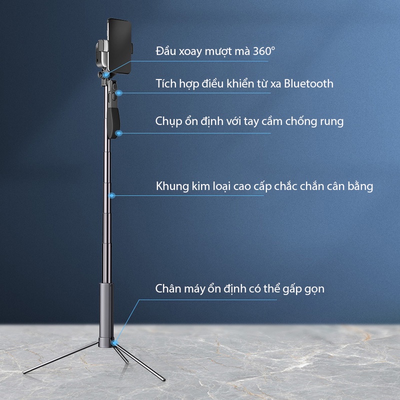 Giới thiệu Gậy Chụp Ảnh Siêu Dài Tripod siêu dài 1m6 cứng cáp A21 tích hợp Remote Bluetooth, đèn chiếu sáng LED