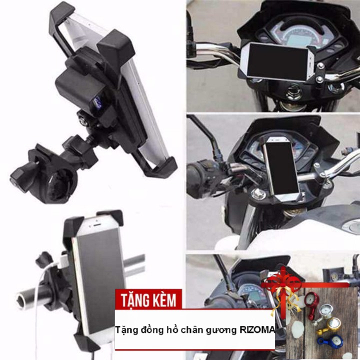 Giá đỡ điện thoại có sạc gắn ghi đông trên mô tô, xe máy cổng sạc USB - Tặng kèm đồng hồ chân gương tiện lợi