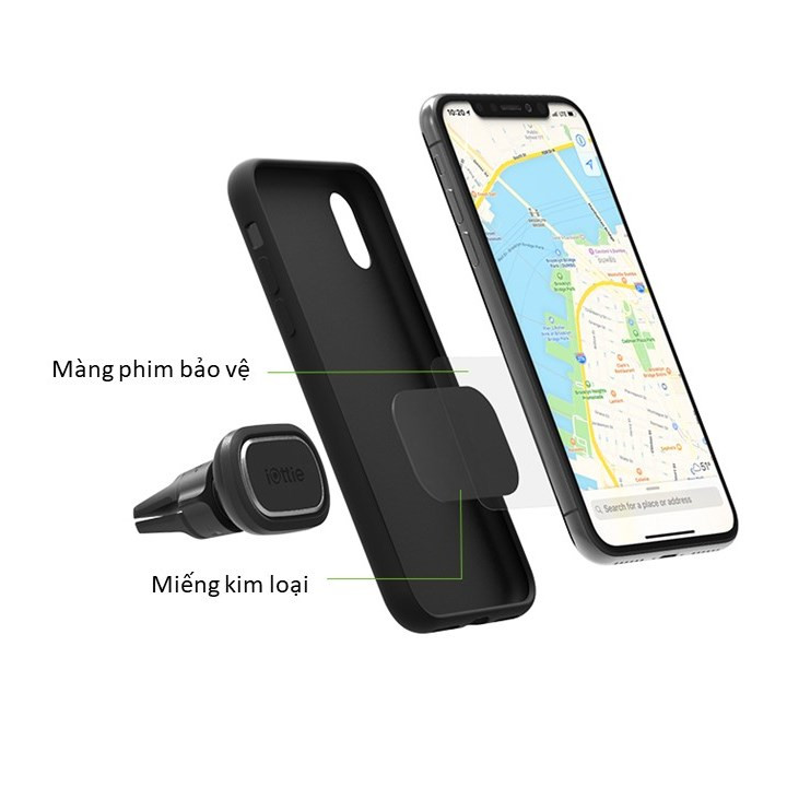 Một bộ miếng kim loại gồm miếng nhỏ và miếng lớn với một màng phim bảo vệ dính trực tiếp vào mặt sau của điện thoại hoặc ốp lưng, nhưng không ảnh hưởng tới sạc không dây khi đặt đúng vị trí tương ứng. Khóa xoay sẽ giữ chặt giá đỡ trên thanh cửa gió điều hòa.