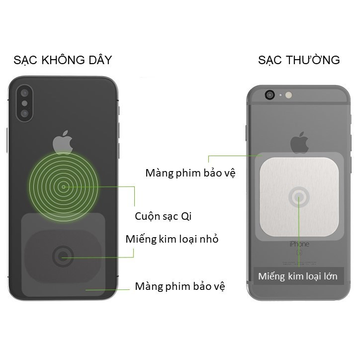 Bộ phụ kiện đi kèm bao gồm hai miếng kim loại và màng phim dùng cho điện thoại có tính năng sạc không dây hoặc không có sạc không dây.
