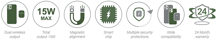 *Lưu ý: Đế sạc phù hợp với các thiết bị có hỗ trợ sạc không dây, riêng chức năng sạc mag.safe chỉ hỗ trợ cho các dòng từ i.phone 12 series trở lên và các dòng tai nghe có hỗ trợ sạc mag.safe. Lực hút từ tính chỉ hỗ trợ tốt khi sử dụng ốp lưng có độ dày <=5mm
