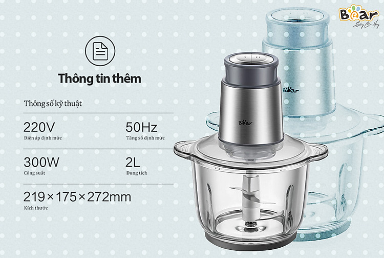 | Công suất | Động cơ 300W giúp xay nhuyễn thịt và nhiều thực phẩm |