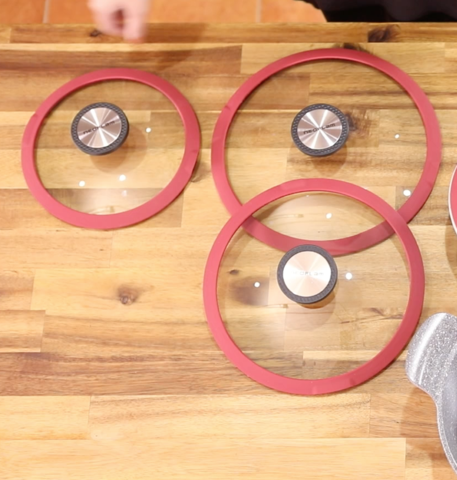 Bằng thuỷ tinh, chịu được nhiệt từ -40 đến 280°C. Viền vung bằng silicone an toàn nên vừa và êm khít với nồi, chảo cùng cỡ.