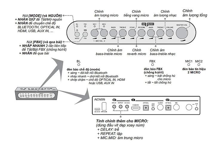 2 ngõ ra âm thanh nhạc+mic AUX OUT (jack 3.5mm & 6.35mm) nối với loa BT, dàn âm thanh ngoài, ...