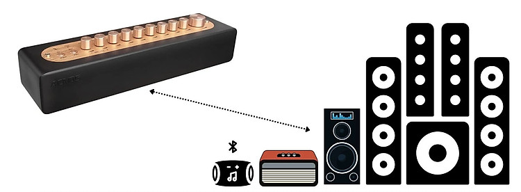 Mặt máy sử dụng bảng điều khiển bằng dãy nút vặn mạ vàng, rất dễ dàng điều chỉnh âm lượng và chuyển đổi các chế độ hỗ trợ khác nhau như Bluetooth, Optical, Guitar,...