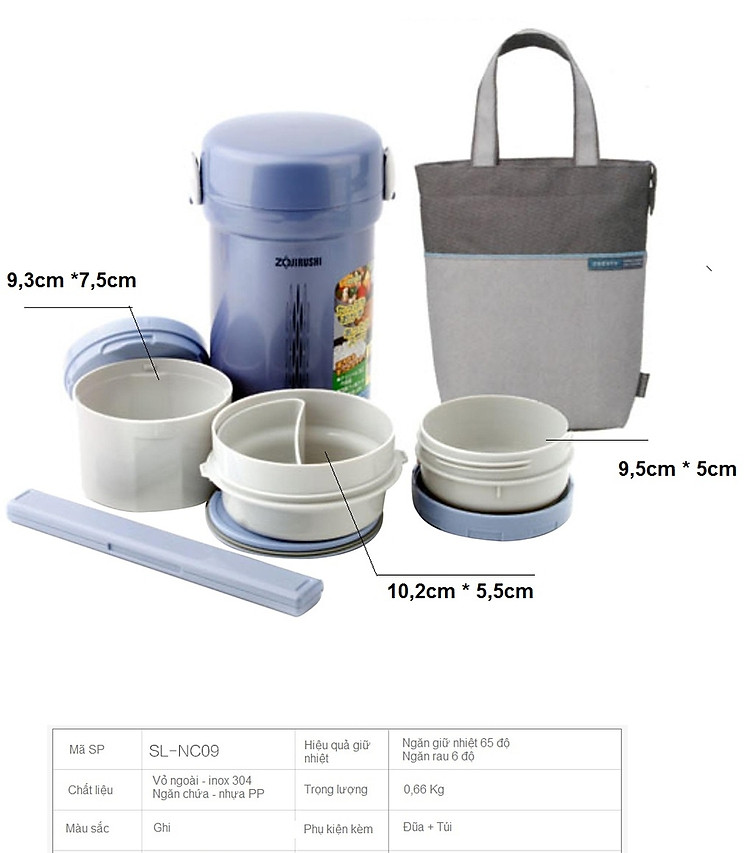 Được trang bị 3 hộp nhỏ riêng biệt với 3 kích thước lớn nhỏ khác nhau giúp bạn linh hoạt trong việc đựng thức ăn phù hợp, kèm theo là bộ đũa và túi xách, hộp đựng cơm Zojirushi SL-NC09-AA phù hợp đựng cơm và thức ăn mang đi học, đi làm hay đi dã ngoại...