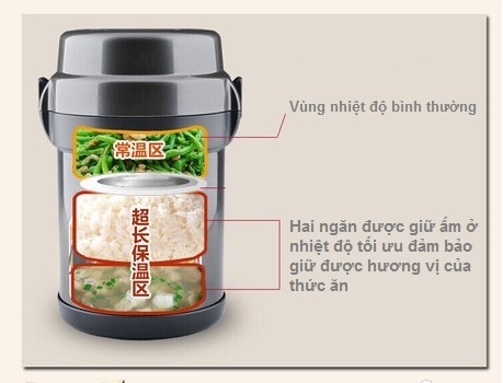 Sản phẩm được sản xuất bằng công nghệ cách nhiệt chân không hiện đại, giúp giữ nhiệt hoàn hảo. Thiết kế với một bình chứa lớn bằng thép không gỉ, có nắp đậy chắc chắn, kín, cùng với khớp khóa chặt, thì thức ăn bên trong của bạn sẽ được giữ ấm cực tốt. 3 ngăn chứa bên trong đều có nắp đậy chặt riêng biệt, ngoài công dụng giữ cho thức ăn không đổ ra ngoài, còn giúp giữ ấm thức ăn tối đa. Bạn sẽ thưởng thức bữa cơm nóng ấm bất cứ khi nào.