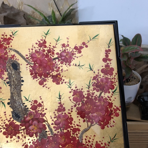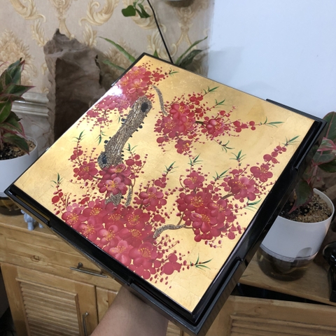 Hộp mứt Tết sơn mài vẽ hoa đào - khay đựng mứt sơn mài - Hình vuông 30x30cm - Thủ công mỹ nghệ sơn mài Việt Nam