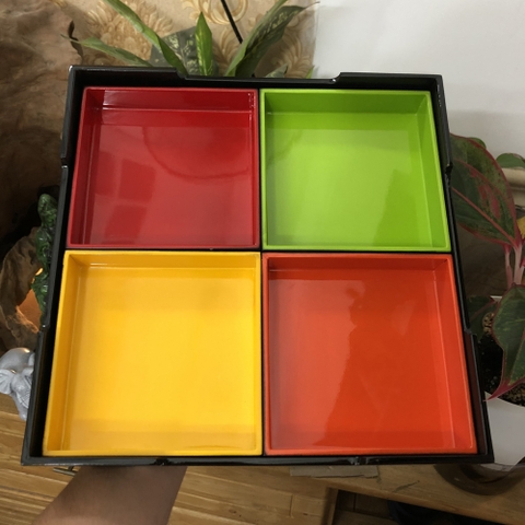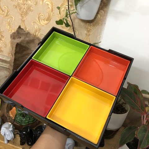 + Hộp mứt sơn mài được thiết kế 4 ngăn vuông rất tiện lợi cho việc đựng bánh mứt ngày tết, dễ dàng tháo lắp để vệ sinh và lưu giữ khi không có nhu cầu sử dụng.