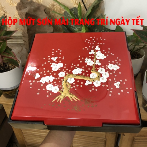 - 01 Hộp mứt Tết sơn mài vẽ hoa mai nổi - khay đựng mứt sơn mài - Hình vuông 30x30cm - Thủ công mỹ nghệ sơn mài Việt Nam
