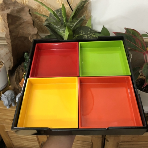 + Hộp mứt sơn mài được thiết kế 4 ngăn vuông rất tiện lợi cho việc đựng bánh mứt ngày tết, dễ dàng tháo lắp để vệ sinh và lưu giữ khi không có nhu cầu sử dụng.