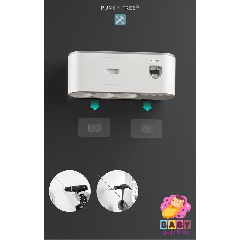 - Bộ sản phẩm gồm: Kệ OENON + Cốc hút từ tính + Miếng dán tường