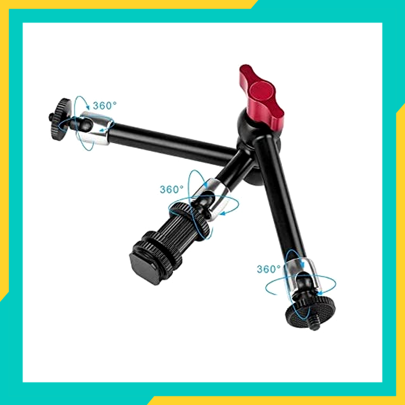 Với đầu xoay 360 ở cuối cánh tay giúp bạn sử dụng thoải mái khi cần thiết bị ở mọi góc độ. Khớp nối có đế gắn hot shoe gắn được máy ảnh, máy quay phim, đầu vít 1/4 inch ở cuối 2 cánh tay có thể gắn tất cả các thiết bị có lỗ ren 1/4". Khóa kim loại để thả lỏng hoặc siết chặt tất cả các cánh tay, và thiết kế lưới bánh răng kim loại để giúp magic arm chịu lực hơn, tránh trượt giữa các đầu bi. Khớp nối này hoàn hảo cho đèn video led, màn hình trường, đèn flash, micrô, máy ảnh dslr & máy quay phim, và tất cả các thiết bị nhiếp ảnh chuyên nghiệp.