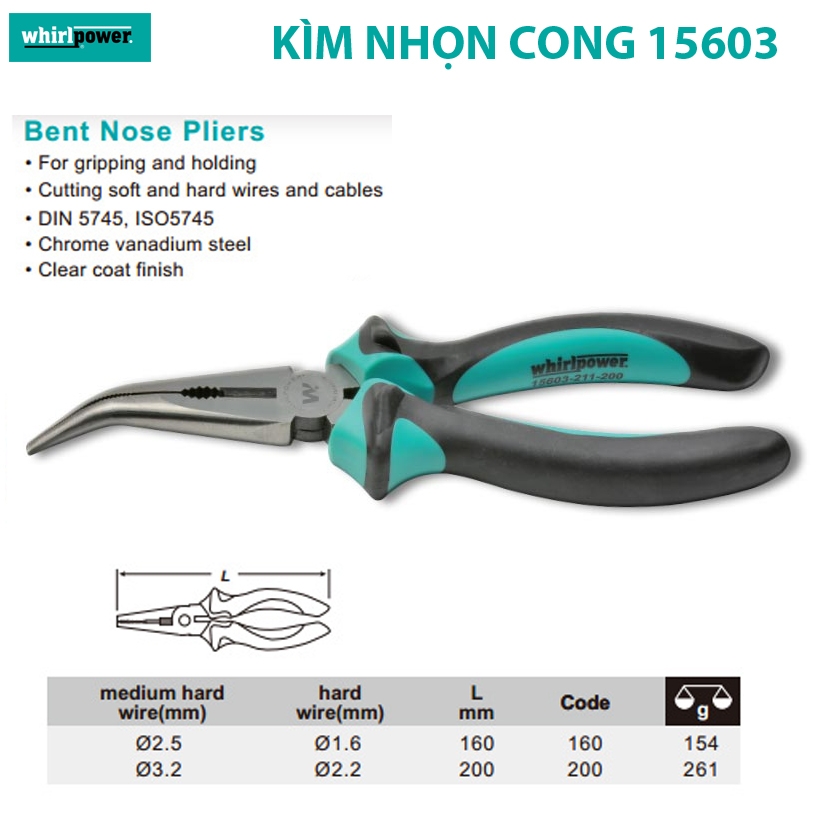- Kìm mũi nhọn cong 6"/ 160mm Whirlpower 15603-211-160