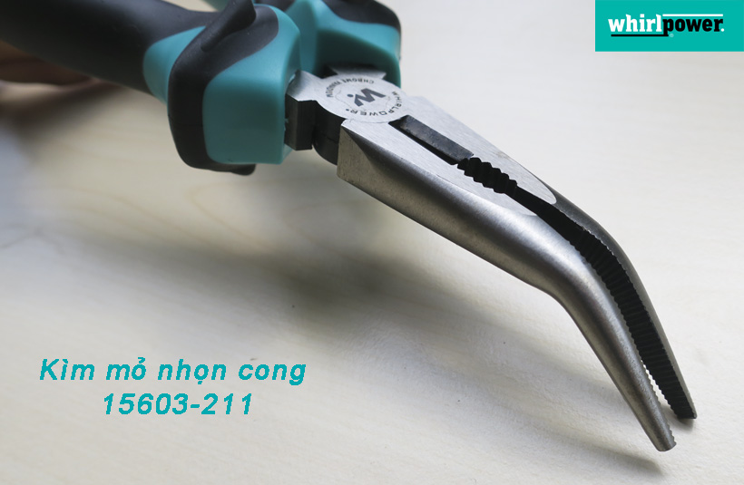 - Kìm nhọn mũi cong Whirlpower là dạng kìm có thiết kế mũi cong, có răng cưa nên độ chính xác cao. Mũi cong và dài giúp bạn có thể linh hoạt và tiện lợi cho những chi tiết khó xử lý, đặc biệt thích hợp với các chi tiết nhỏ và làm việc trong không gian hẹp.