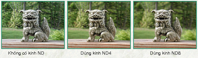 Trong các hình minh họa dưới đây Hình không dùng kính lọc nên hiệu quả xóa phông chưa cao. Hai hình bên phải dùng thêm kính lọc ND4 và ND8 nên độ mở ống kính tăng 2 và 3 f-stop. Kết quả là khoảng ảnh rõ thu hẹp lại và chủ đề nổi bật hơn trên phông nền bị xóa mờ. Trong trường hợp ánh sáng quá gắt cũng có thể dùng ND nhiều stops hơn để ống kính có thể mở rộng hơn.