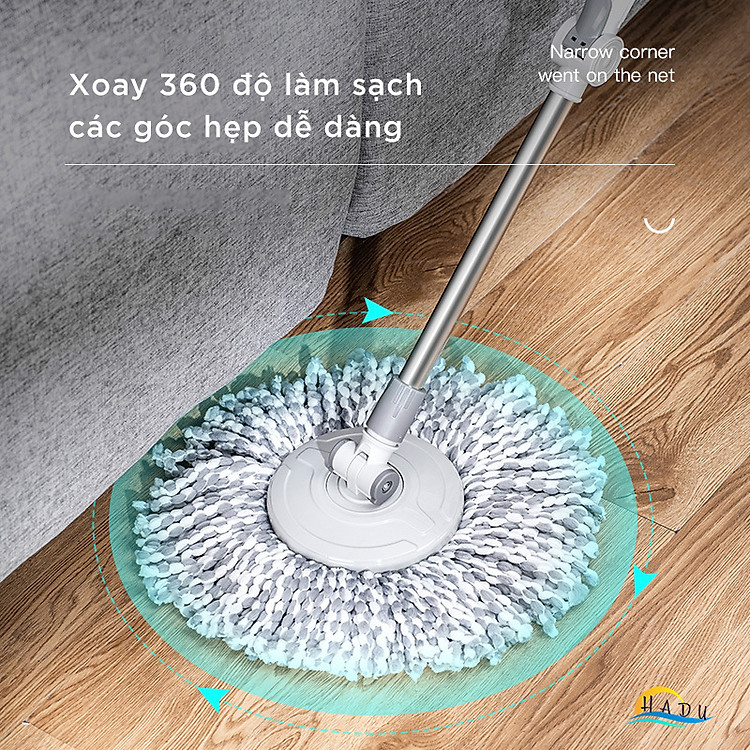- Cây lau nhà được thiết kế xoay tròn 360° dễ dàng luồn lách vào những khu vực chật hẹp nhất.