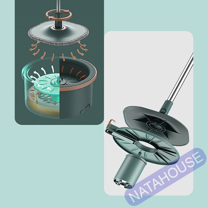 - Bước 3: Đặt cây lau đúng vị trí chính giữa thùng, nhấn mạnh cây lau cho bàn lau xoay, hệ thống xịt nước sạch lên giặt vải lau, và nước bẩn được chảy ra ngoài ngăn chứa riêng biệt.