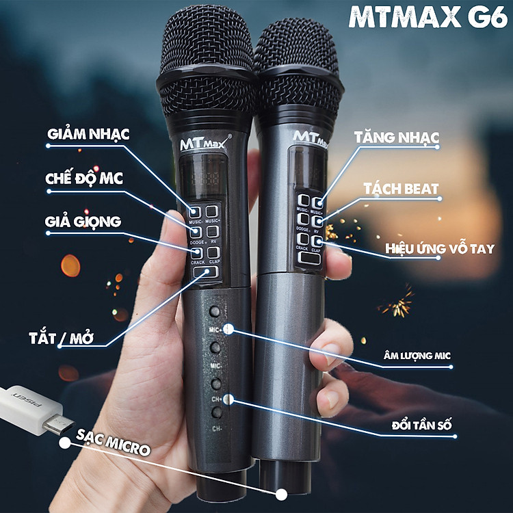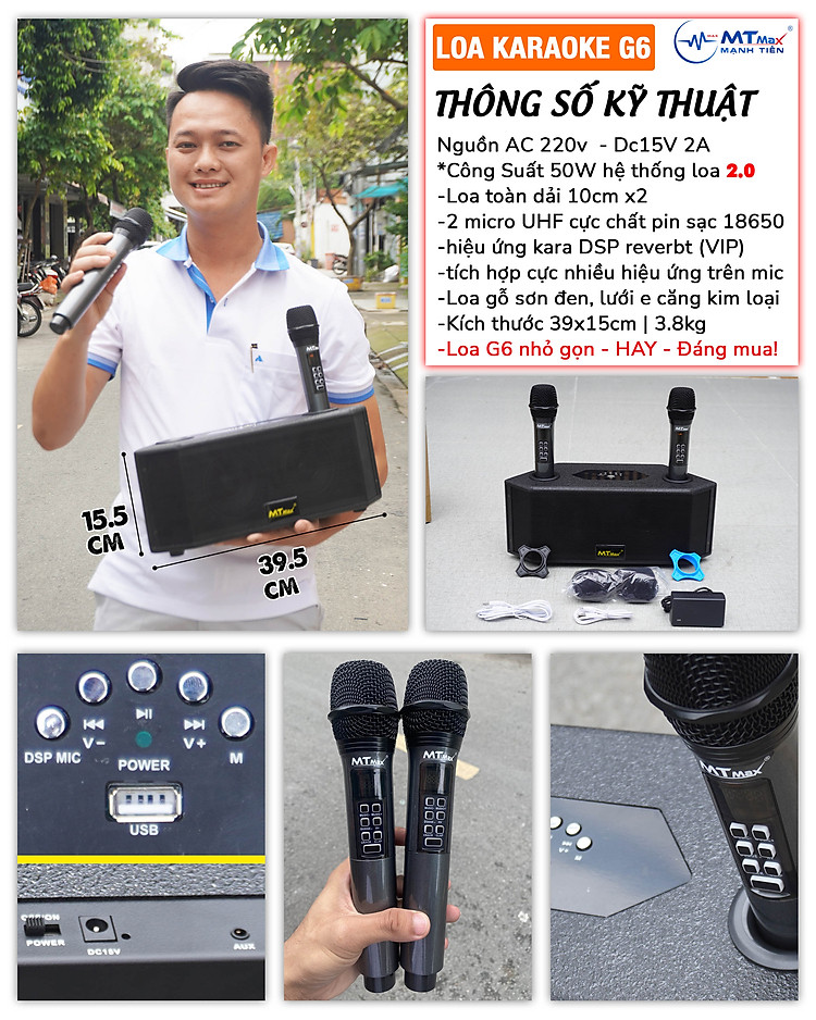 Loa karaoke MTMAX G6 với kích thước nhỏ gọn nhưng âm thanh nghe nhạc hay, dùng hát karaoke hiệu quả trên cả 2 khoảng không gian là trong nhà và ngoài trời.