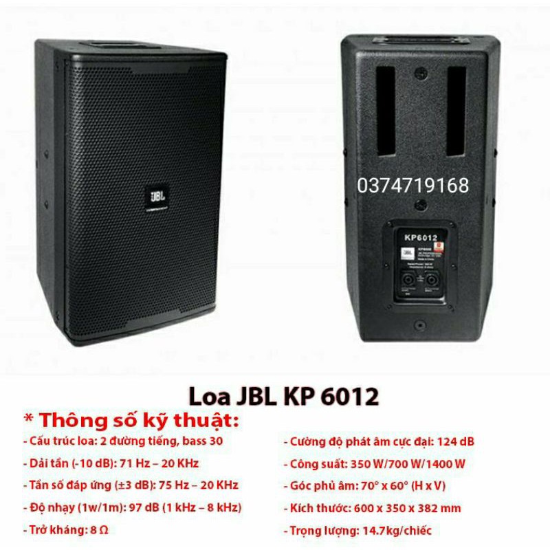 Thông số kĩ thuậtLoa JBL KP 6012 là dòng loa cao cấp với tính năng hát karaoke tuyệt vời. Hoạt động với công suất trung bình 350W, đạt cực đại 1400W, độ nhạy âm cao 97dB, trở kháng 8ohm.Chất lượng âm thanh rõ ràng, trong trẻoLoa được tích hợp loa bass 30cm, dải âm rộng từ 75 Hz – 20 KHz nên âm bass phát ra không quá mạnh, rất chắc và đều. Bên cạnh đó còn có 1 loa treble 3,75cm nên âm thanh rõ và sáng. Loa JBL KP 6012 cho tín hiệu âm rất đều, không mất tín hiệu, không đứt gãy và khi lên cao âm thanh khá rõ không bi rè hú khi xuống thấp âm vẫn nghe được.