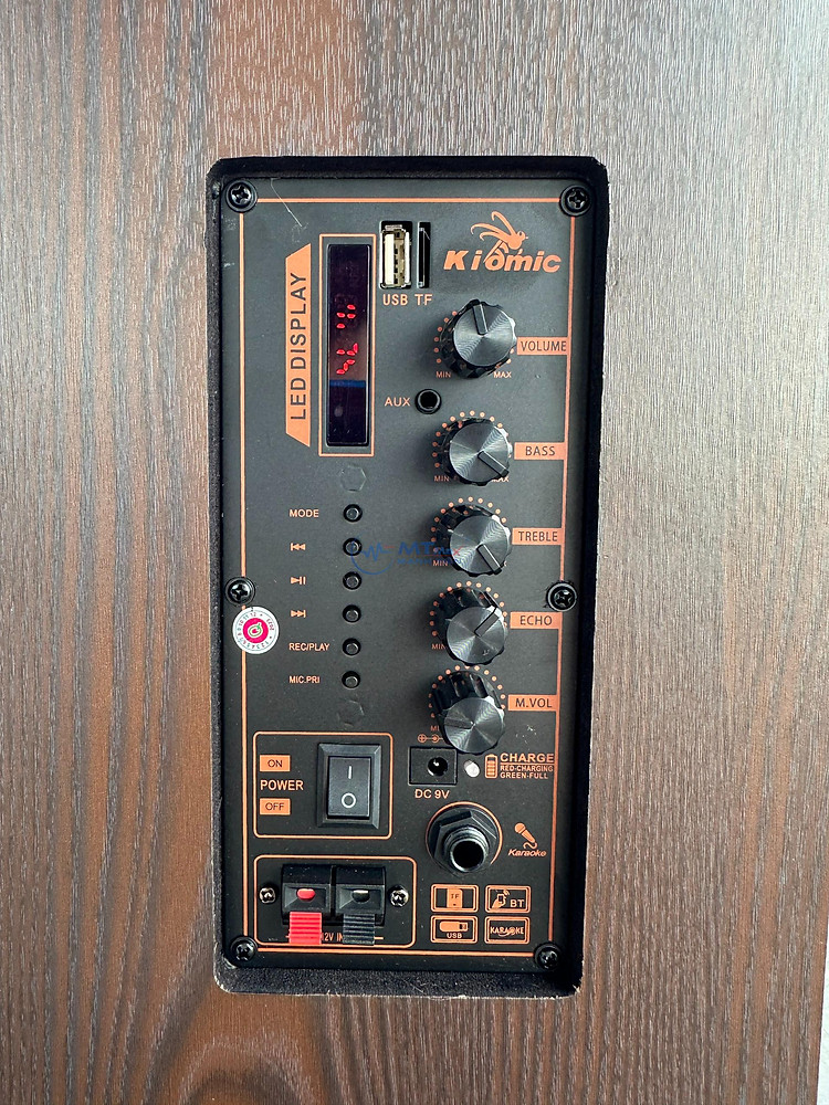 Bộ điều khiển của Loa xách tay K32 được thiết kế dễ nhìn và dễ hiểu. Màn hình LED hiển thị kết nối giúp bạn dễ dàng thao tác và điều chỉnh các yếu tố âm thanh như Echo, Reverb, Bass. Nó cũng có nhiều cổng kết nối như Bluetooth, USB, thẻ nhớ TF, và AUX, giúp bạn kết nối với các thiết bị thông minh như laptop, điện thoại di động, hoặc tivi một cách ổn định.