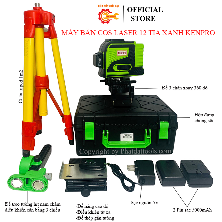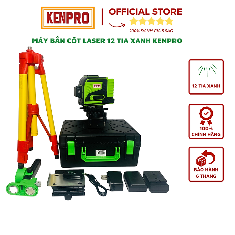 Máy Bắn Cos Laser 12 Tia Xanh KENPRO đi kèm với khá nhiều phụ kiện như chân xoay 360 độ có núm điều chỉnh,giá treo tường hít nam châm,bàn nâng cao độ,chân tripod...giúp bạn tùy biến sử dụng trong nhiều điều kiện thi công khác nhau.
